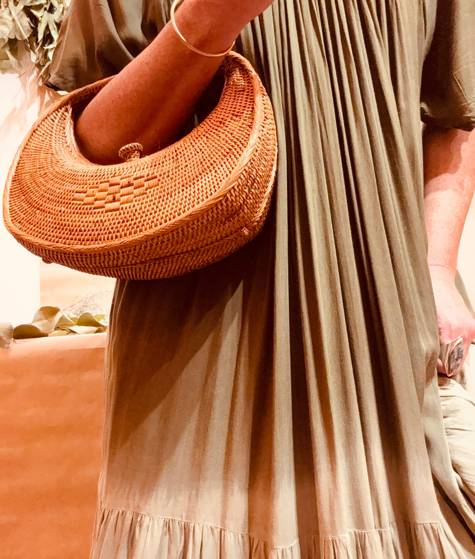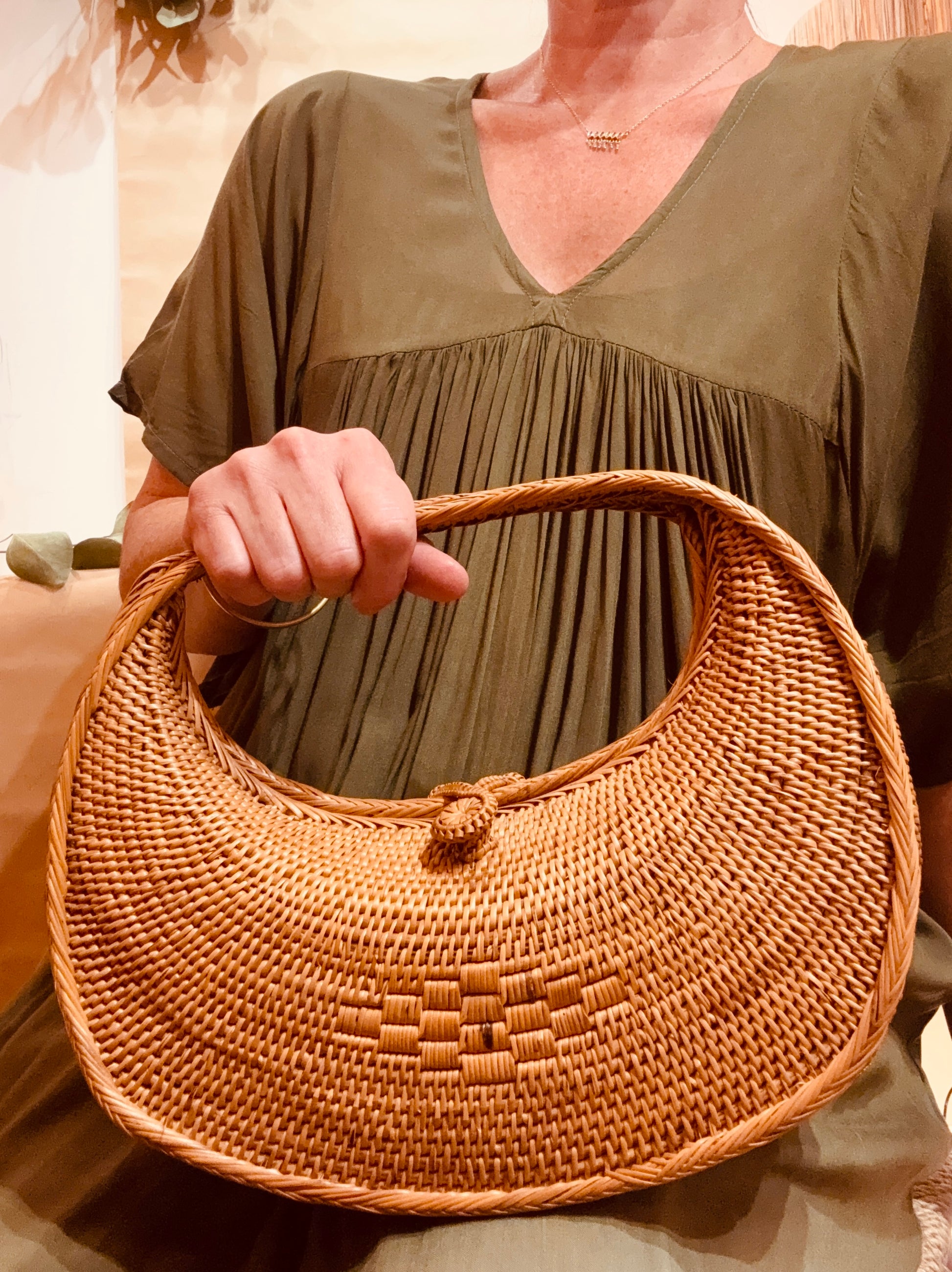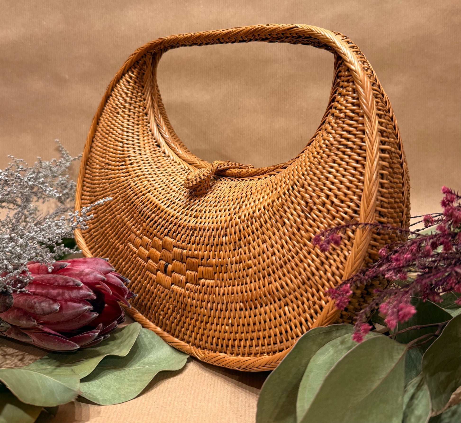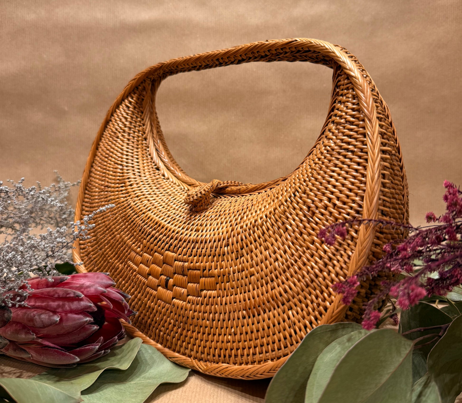 Handwoven from premium ata rattan, The Artisanal Cresent Handbag embodies sculptured chic and sophistication. Each piece is meticulously crafted by Balinese artisans and smoked over coconut husks, enhancing its strength, rich honeyed hue, and delicate toasty aroma. The curved frame is complemented by a traditional fabric lining, complete with a woven clasp for both elegance and practicality. A statement of refined craftsmanship and effortless island luxury.
