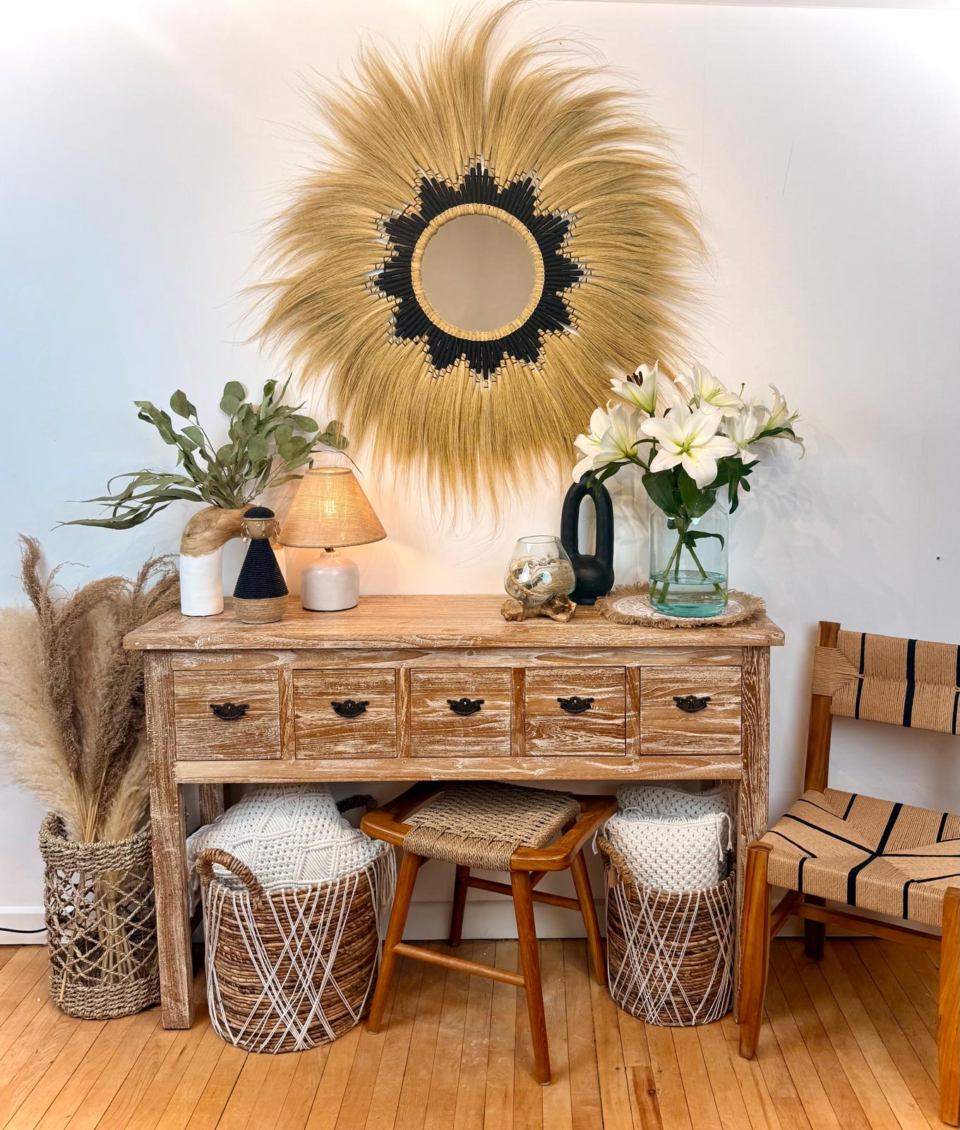 The circular design adds a soft, balanced feel to any room, while the woven cotton, shell, or beaded embellishments lend a unique artisan touch that makes every mirror one of a kind. Perfect as a statement piece in a hallway, living room, or bedroom, this mirror captures that relaxed, sun-washed aesthetic we love here by the sea in Brighton’s South Lanes.