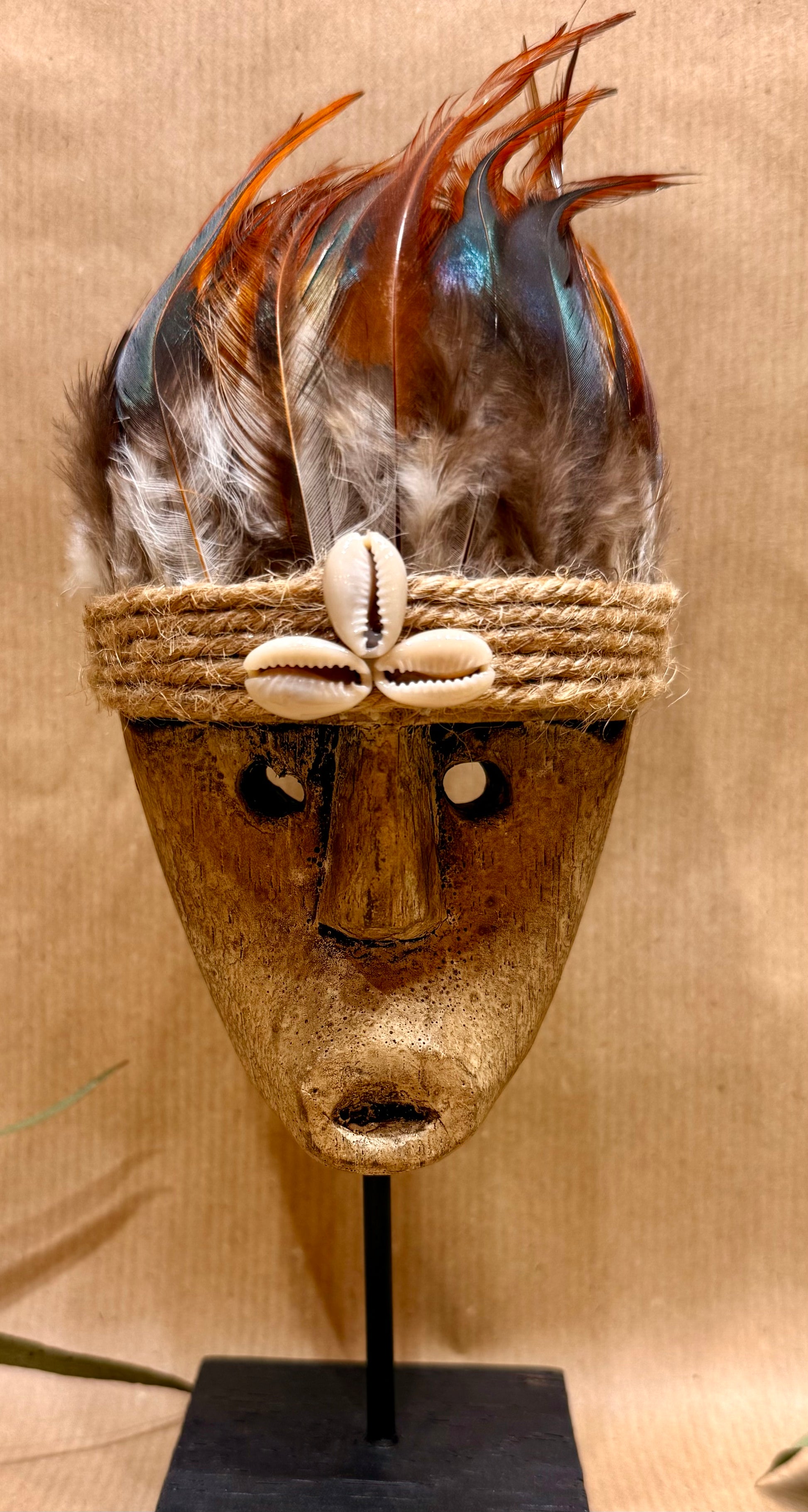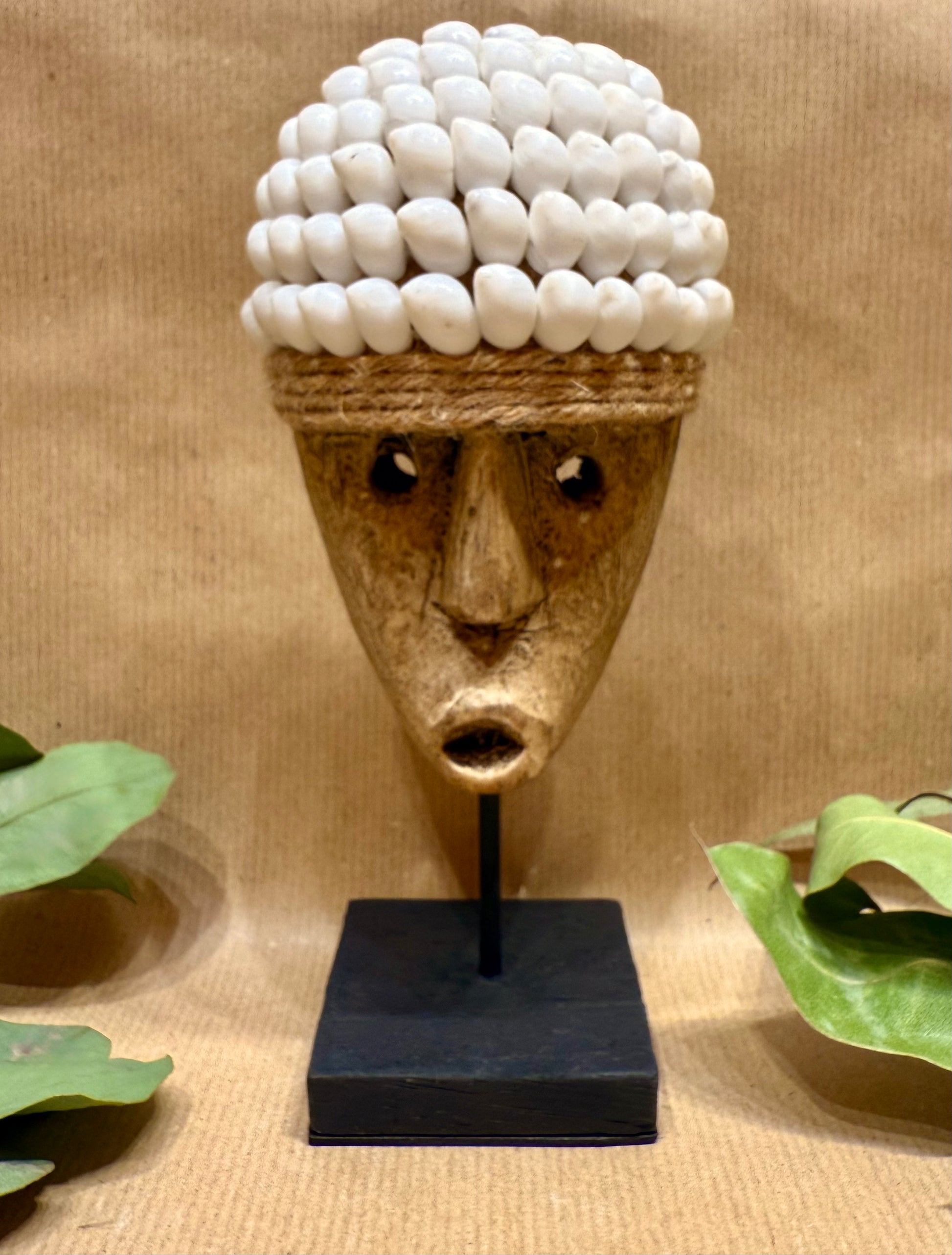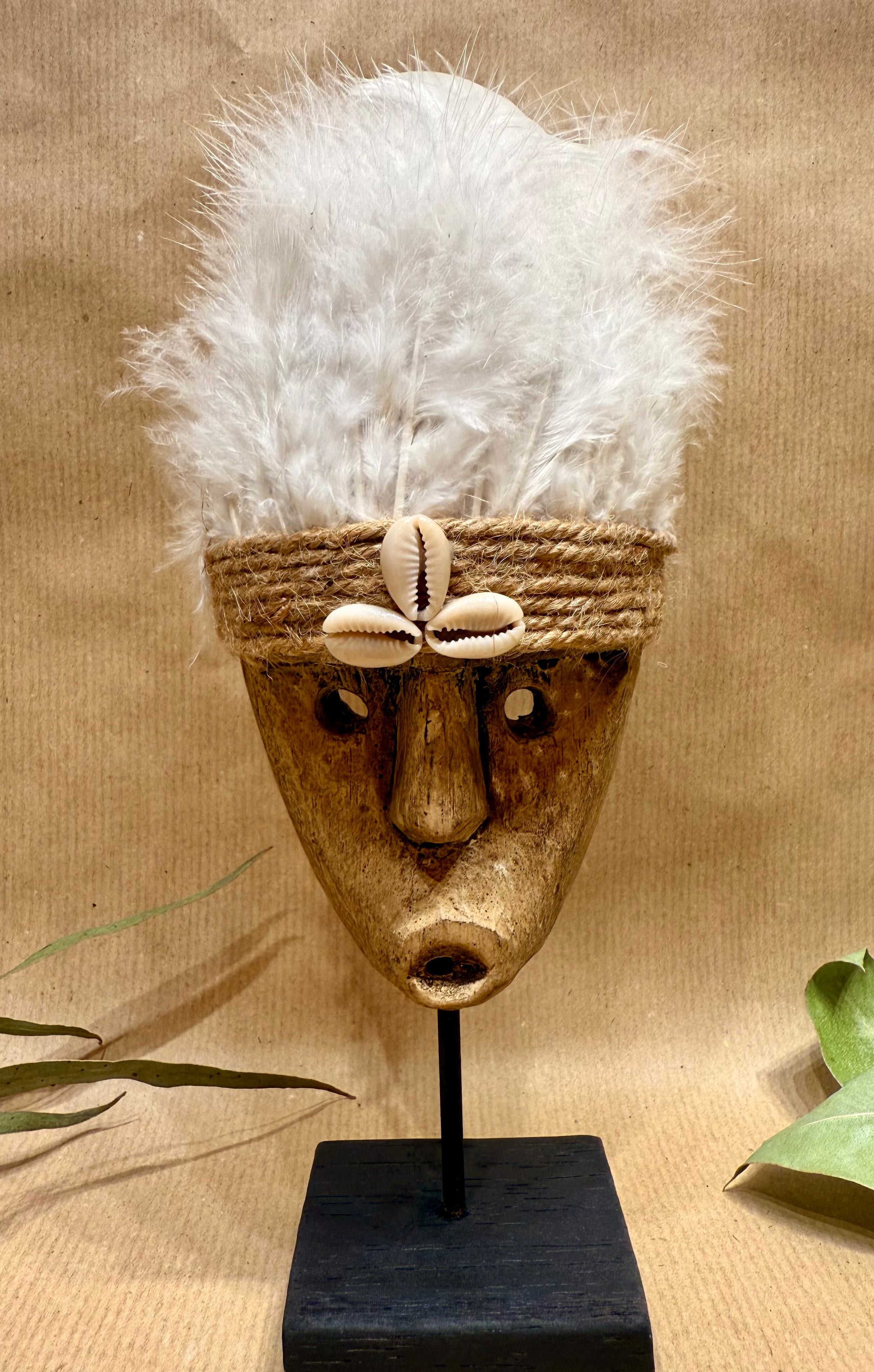 The Juna Mask Sculpture blends natural texture and traditional craft in a truly captivating way. Hand-carved from wood and finished with soft white feathers, jute rope, and natural shells, each piece tells a story of artistry and organic beauty.