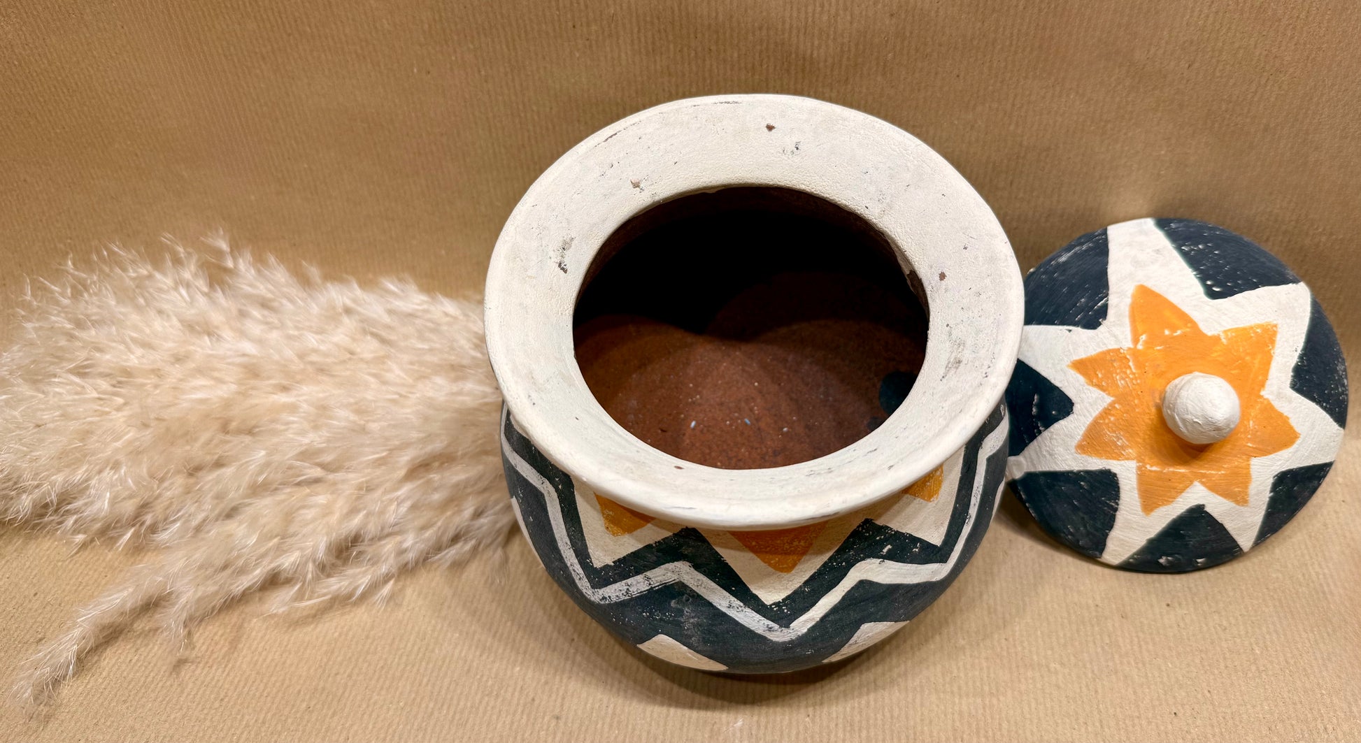 Hand-shaped from natural clay and hand-painted in bold, earthy tones, the Suri Terracotta Pot celebrates colour, texture, and craftsmanship. Each piece features unique geometric designs that reflect traditional artistry, bringing warmth and personality to modern interiors.